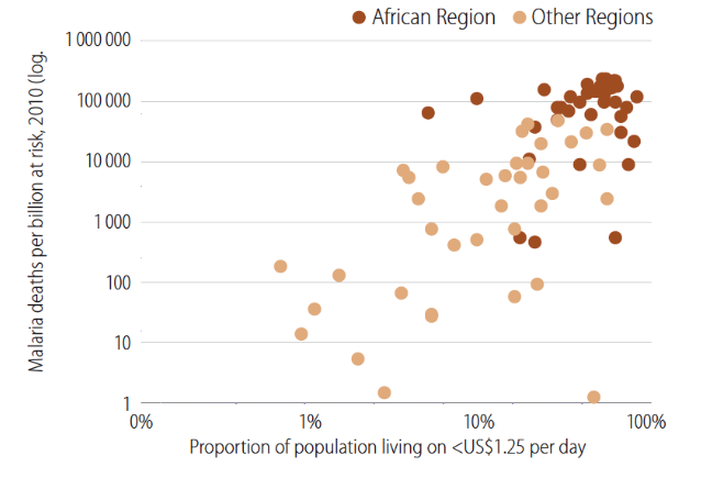 The graph below shows the relationship between poverty and the number of deaths from Malaria in 2010.