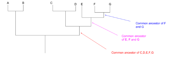 The tree in the diagram shows that species F and G share a recent common ancestor (they evolved to be different species from the same species) . They also share a recent common ancestor with species E but that was further back in time. Even further back in time we can see that species C,D,E,F and G all share a common ancestor