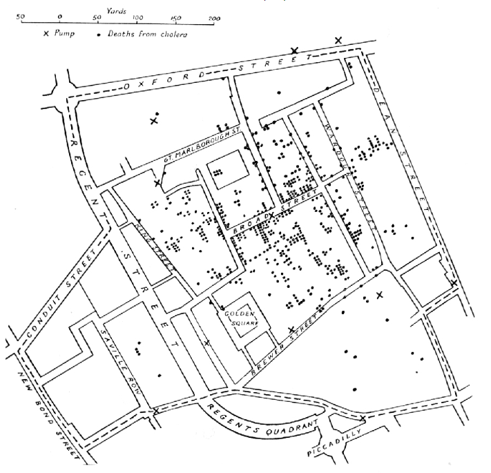 One of the first epidemiologists to do this was John Snow. He mapped the cases of cholera in an area of London and tracked the disease to the broad street water pump