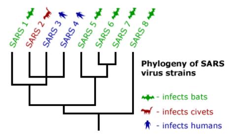 The pathogen which caused SARS was identified as the coronavirus but where had the pathogen come from.Scientists suspected that the virus had been in a different species and then had crossed into humans. Versions of the virus were found in horseshoe bats and civet cats. The genomes of the virus found in bats, civet cats and humans were sequenced.Viruses evolve rapidly. By looking at how different the genome is in the different animals we can create an evolutionary tree (phylogeny) which shows how the virus evolved over time.